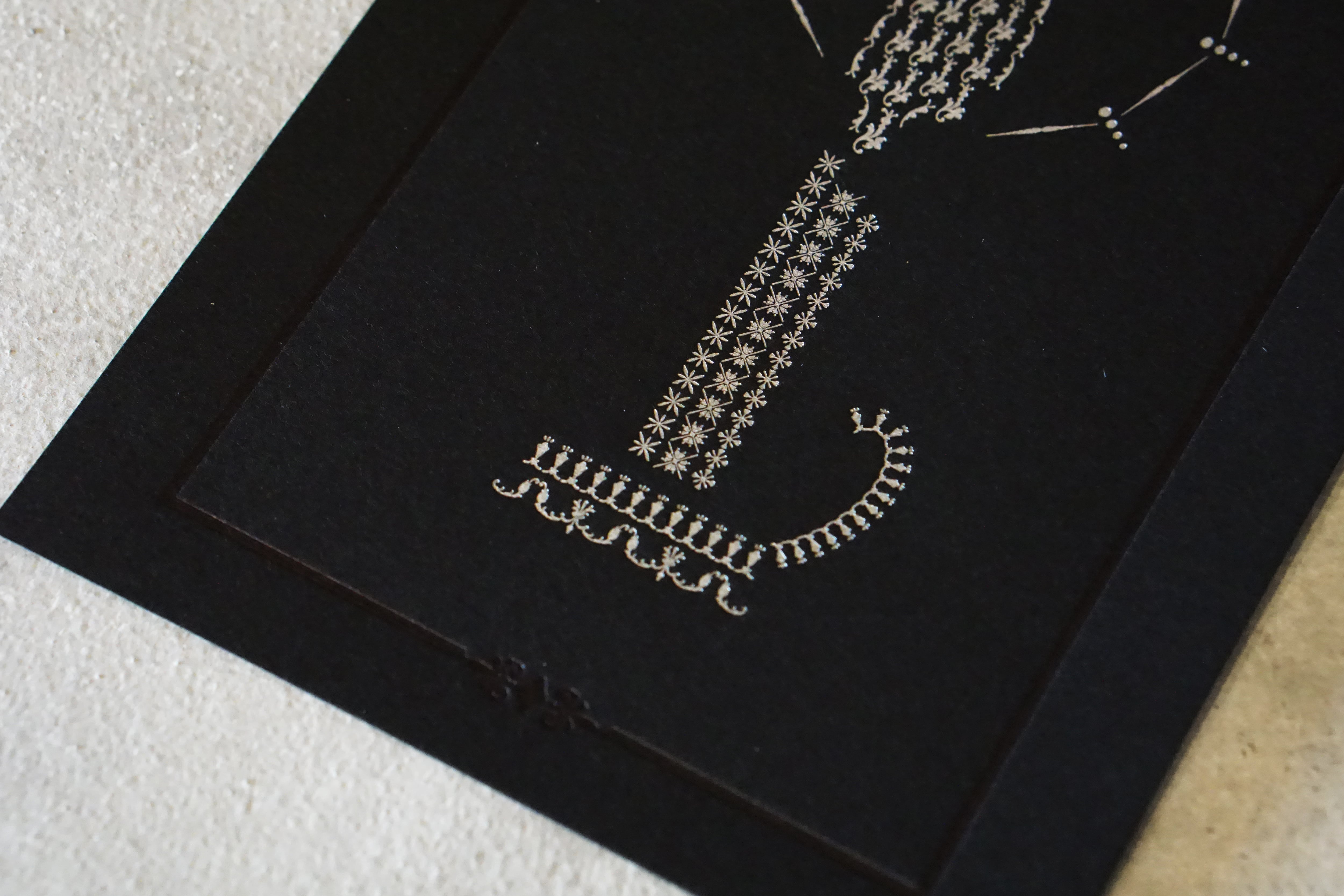 印刷は黒いディープマットの紙に黒と銀のインクで二色で刷りしました。